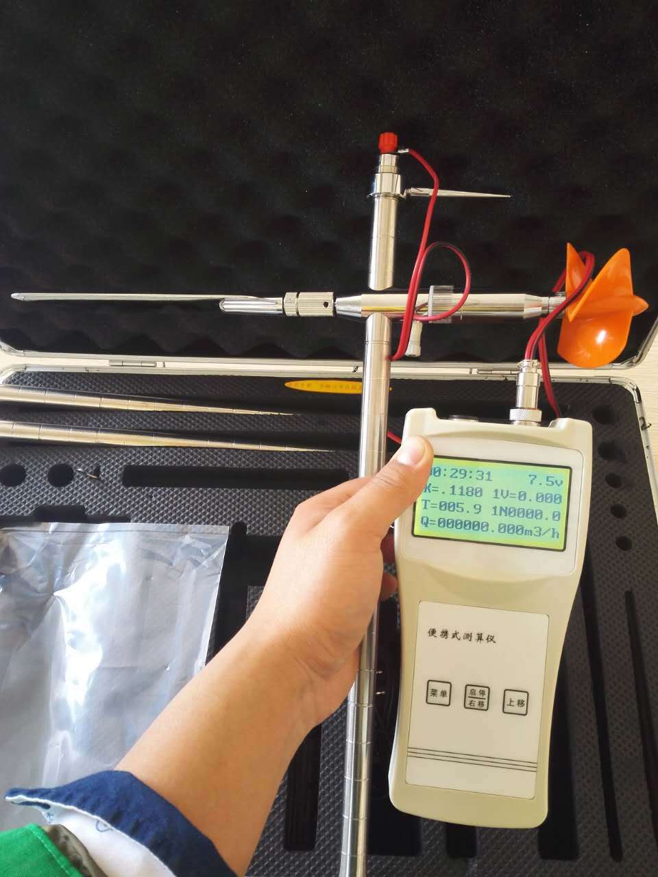 便携式流速仪主要由旋桨式流速传感器(或其它型号的旋杯旋桨流速仪)、流速测算仪、0.4m×4Ф16测杆组成。全套仪器置于高级铝合金密码箱内。使用时,按图1所示组装成一体,接通信号线,即可进行各明渠中流速的测量,并自动显示流速。